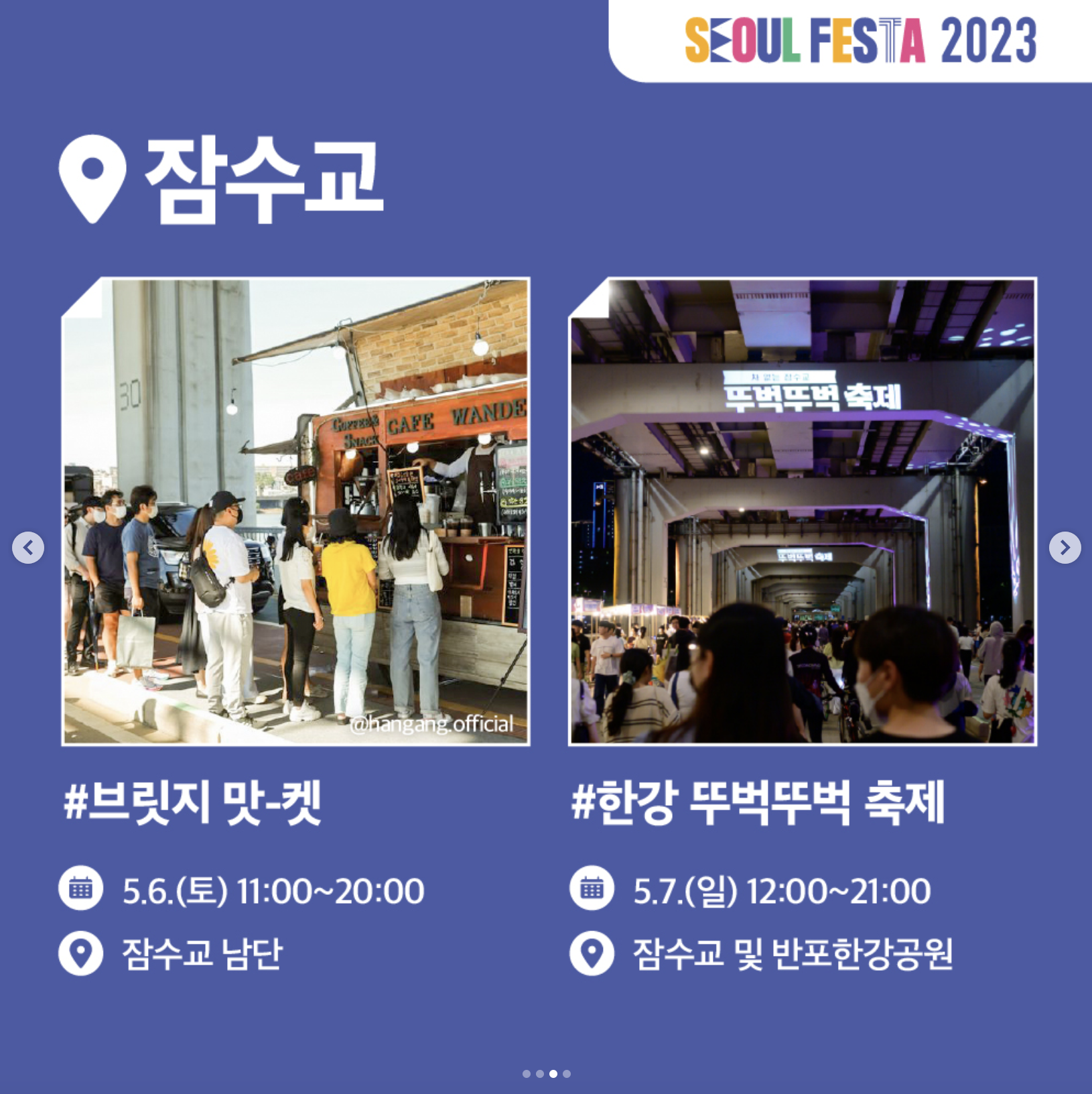 잠수교 뚜벅뚜벅 축제를 아시나요? 오늘은 이번 주말부터 시작하는 2023 잠수교 뚜벅뚜벅 축제에 대해 알려드리겠습니다! 차 없는 잠수교 뚜벅뚜벅 축제는 5월 7일부터 7월 9일까지 매주 일요일 12